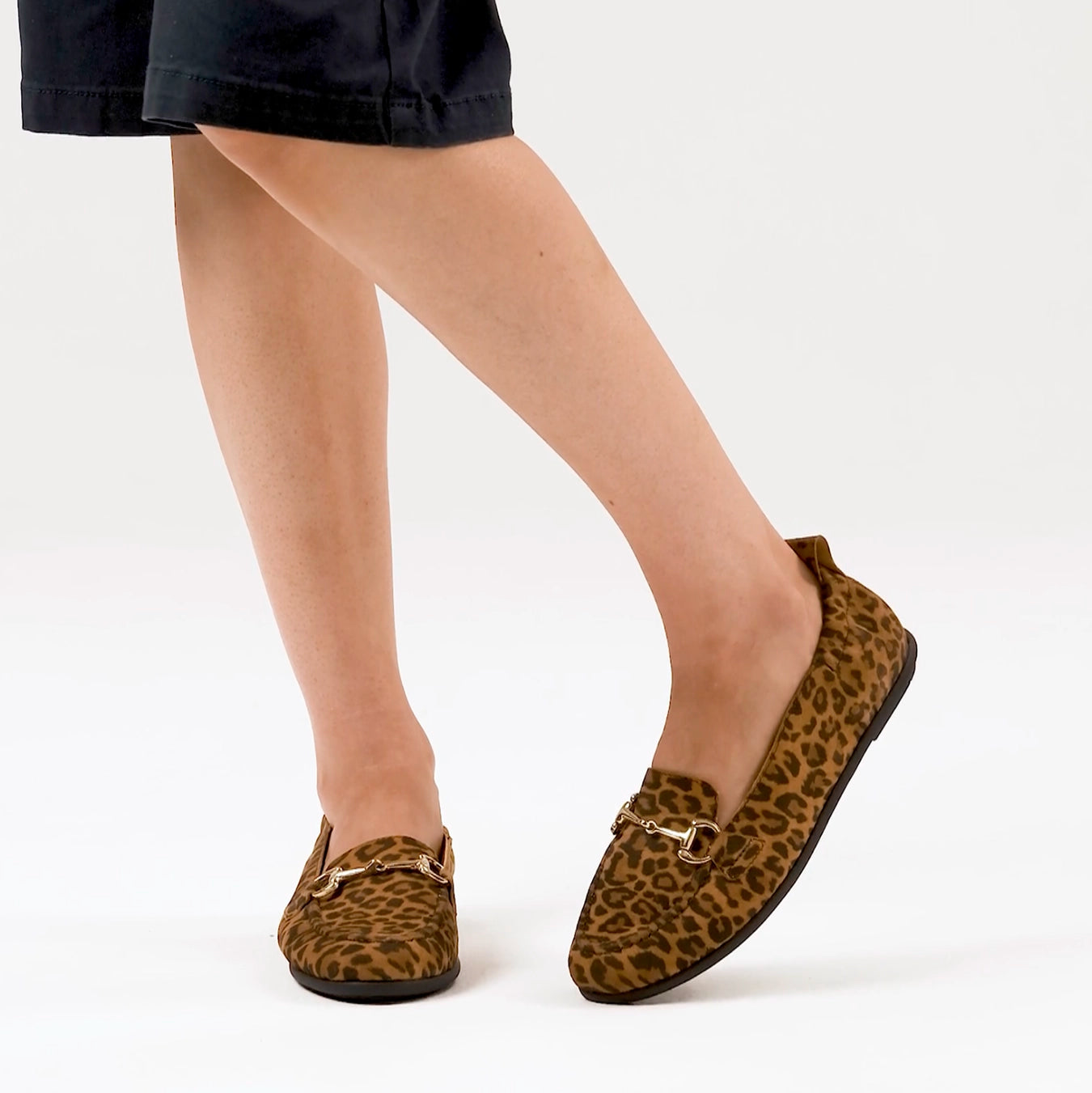 Pair of leopard print loafers with gold buckles on a white background