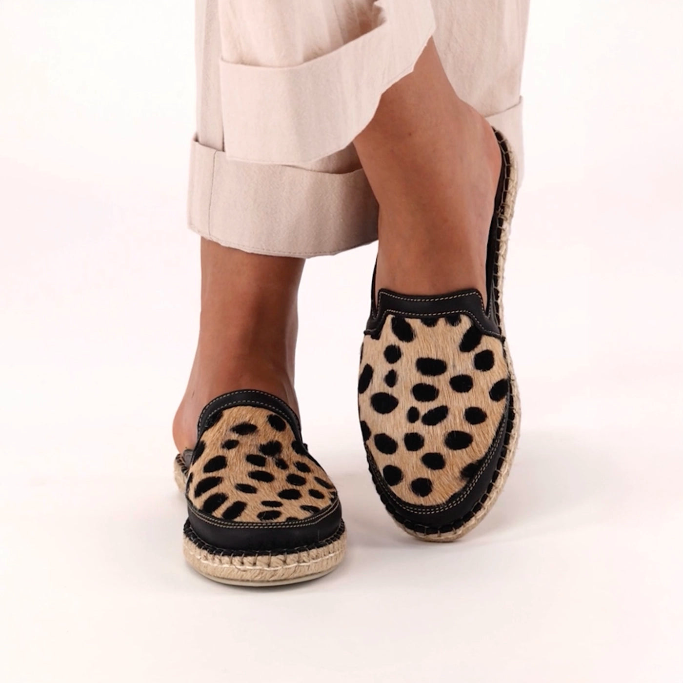 Halamuza : Ladies Leather Espadrille Mule in Black Natan & Spotted Print