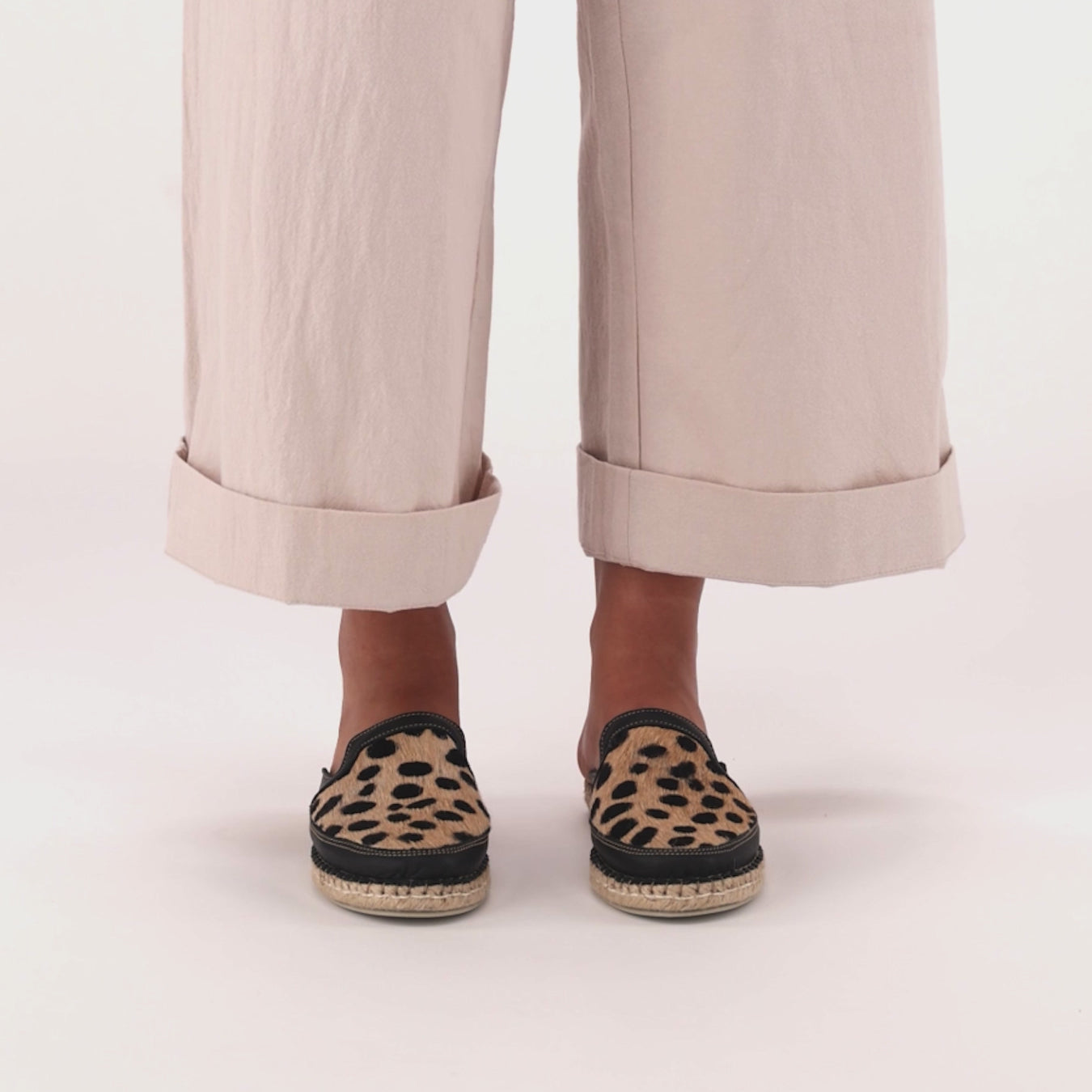 Halamuza : Ladies Leather Espadrille Mule in Black Natan & Spotted Print