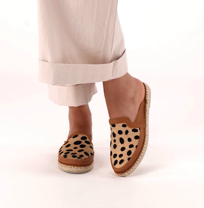 Halamuza : Ladies Leather Espadrille Mule in Oak & Spotted Print