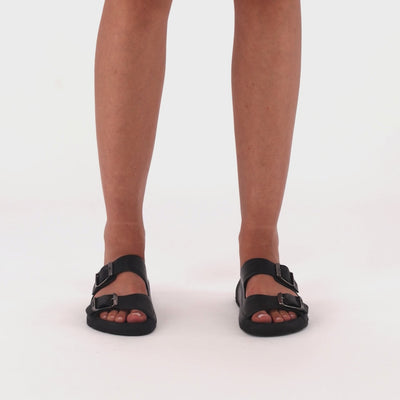 This open-toe flat sandal combines ease and elegance with double buckle strap detailing and a genuine leather upper. Set on a comfortable 2cm flat sole, it features a locally made PU insole that’s lightweight, flexible, and moulded to cup the foot with bounceback memory for lasting comfort in every step.