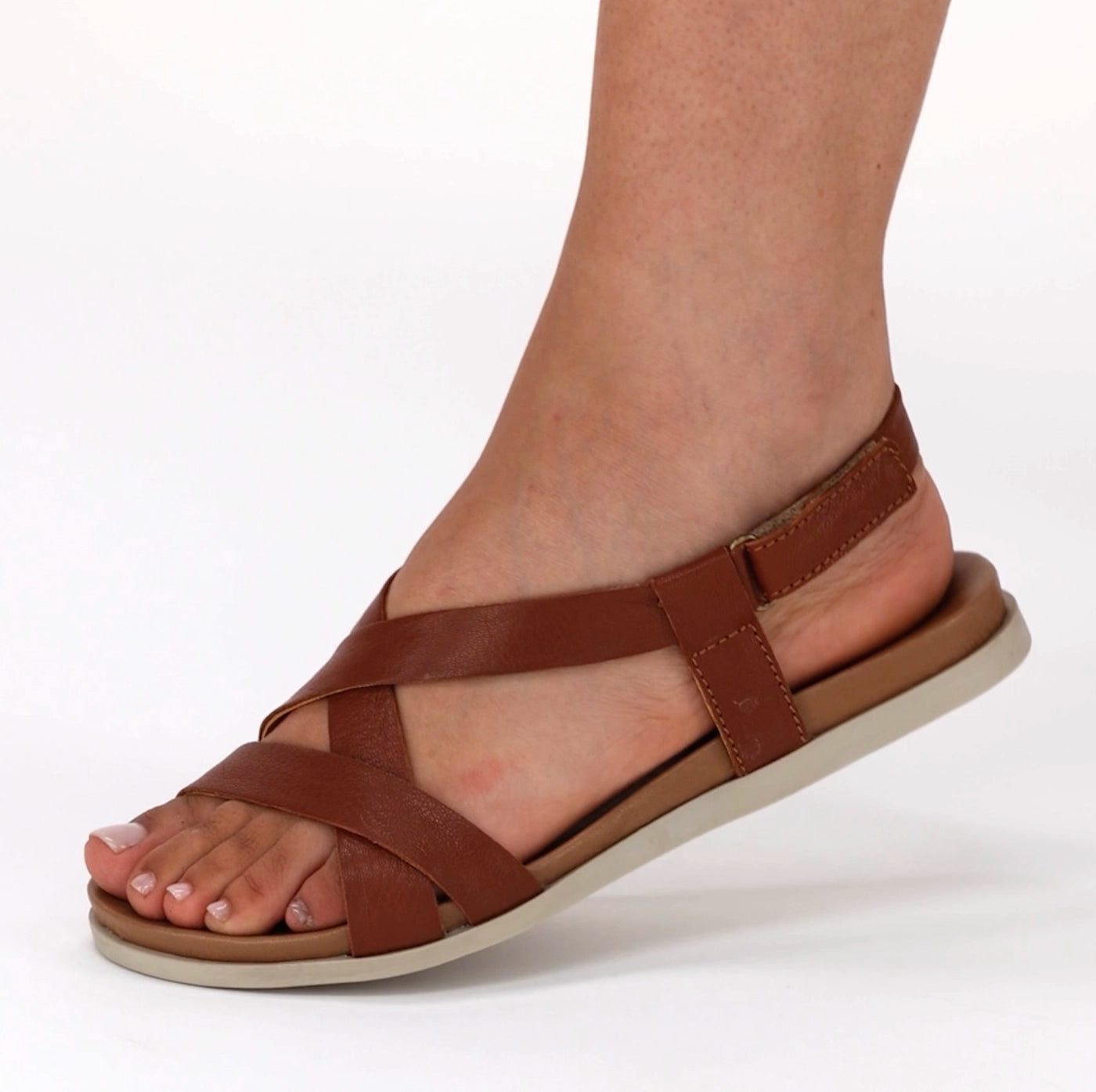 This easy slip-on sandal features a genuine leather upper with a stylish criss-cross vamp design and an adjustable velcro strap for a secure fit. The flat 2cm sole offers everyday ease, while the locally made PU insole is moulded to gently cup the foot with bounceback memory for lasting comfort. Finished with a lightweight, flexible, and non-slip TR outsole, it’s a sandal made for confident, carefree wear.