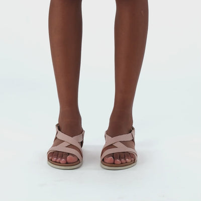 This easy slip-on sandal features a genuine leather upper with a stylish criss-cross vamp design and an adjustable velcro strap for a secure fit. The flat 2cm sole offers everyday ease, while the locally made PU insole is moulded to gently cup the foot with bounceback memory for lasting comfort. Finished with a lightweight, flexible, and non-slip TR outsole, it’s a sandal made for confident, carefree wear.